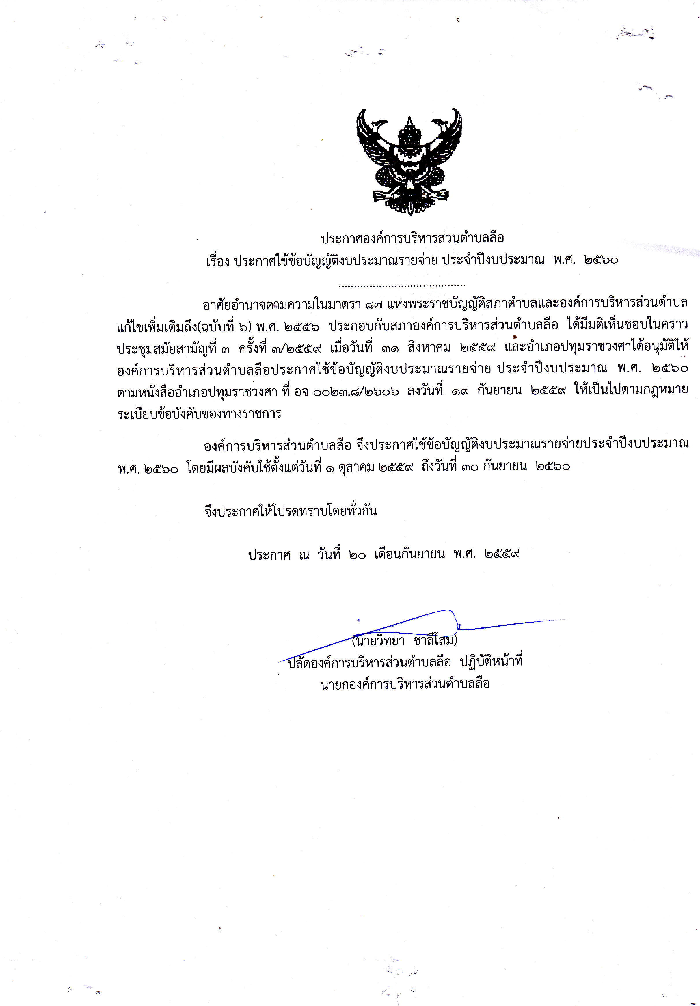 ชื่อเรื่อง : ประกาศใช้ข้อบัญญัติงบประมาณรายจ่าย ประจำปีงบประมาณ พ.ศ. ๒๕๖๐