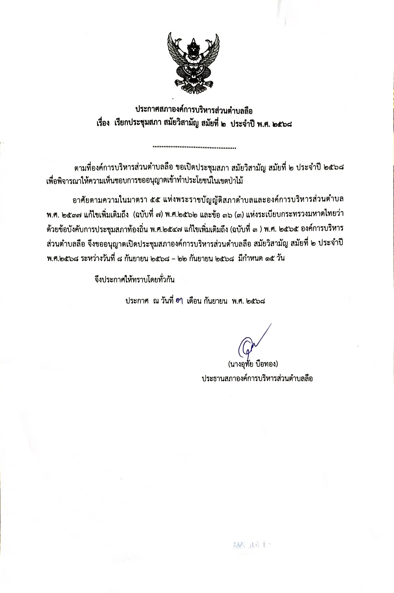 ประกาศสภาองค์การบริหารส่วนตำบลลือ เรียกประชุมสภา สมัยวิสามัญ สมัยที่ ๒ ประจำปี พ.ศ. ๒๕๖๘